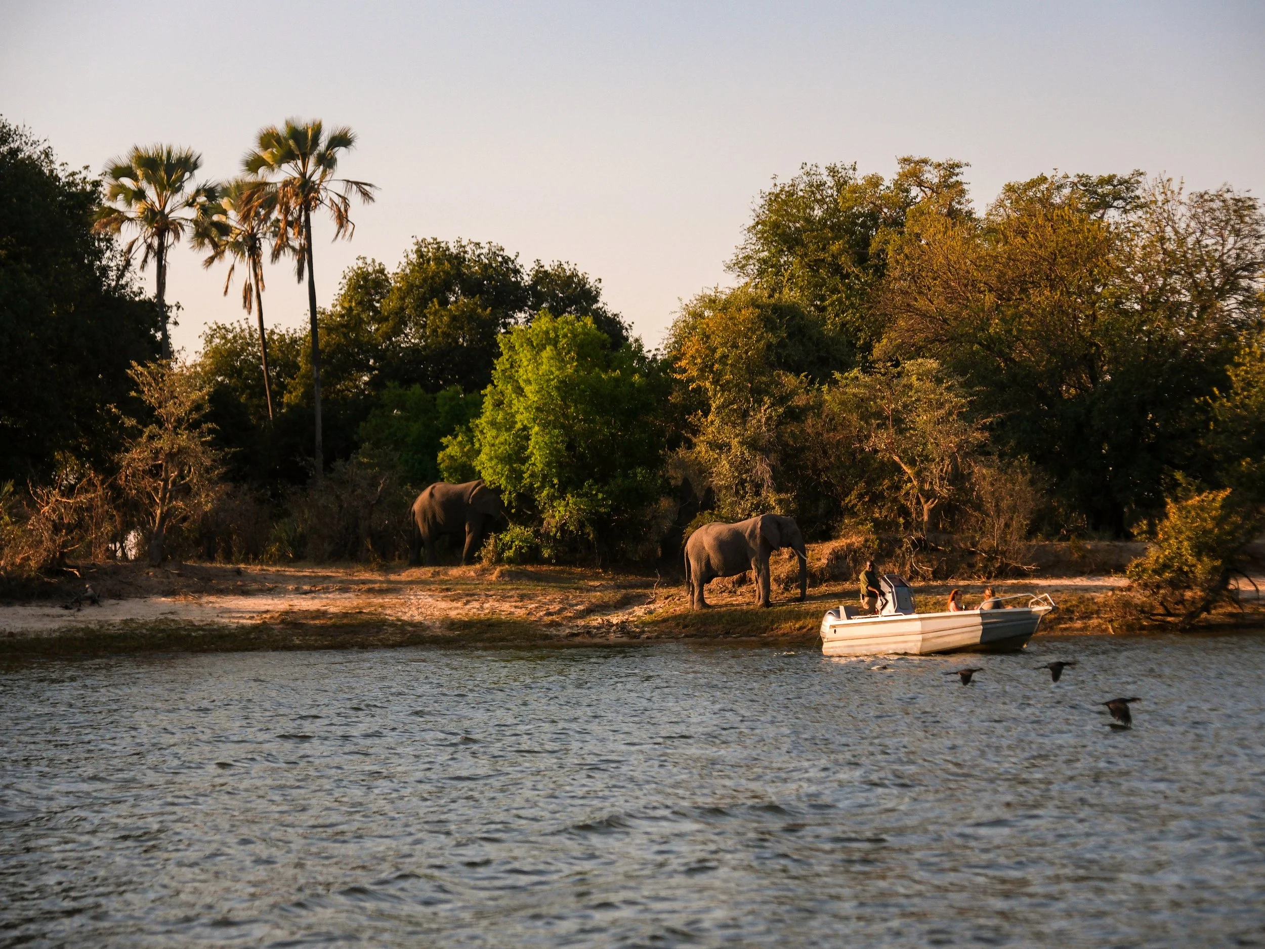 A lakeside scene with a sailboat on the water, multiple people swimming and on paddleboards, and trees framing the view. There are chairs on the shore in the foreground.