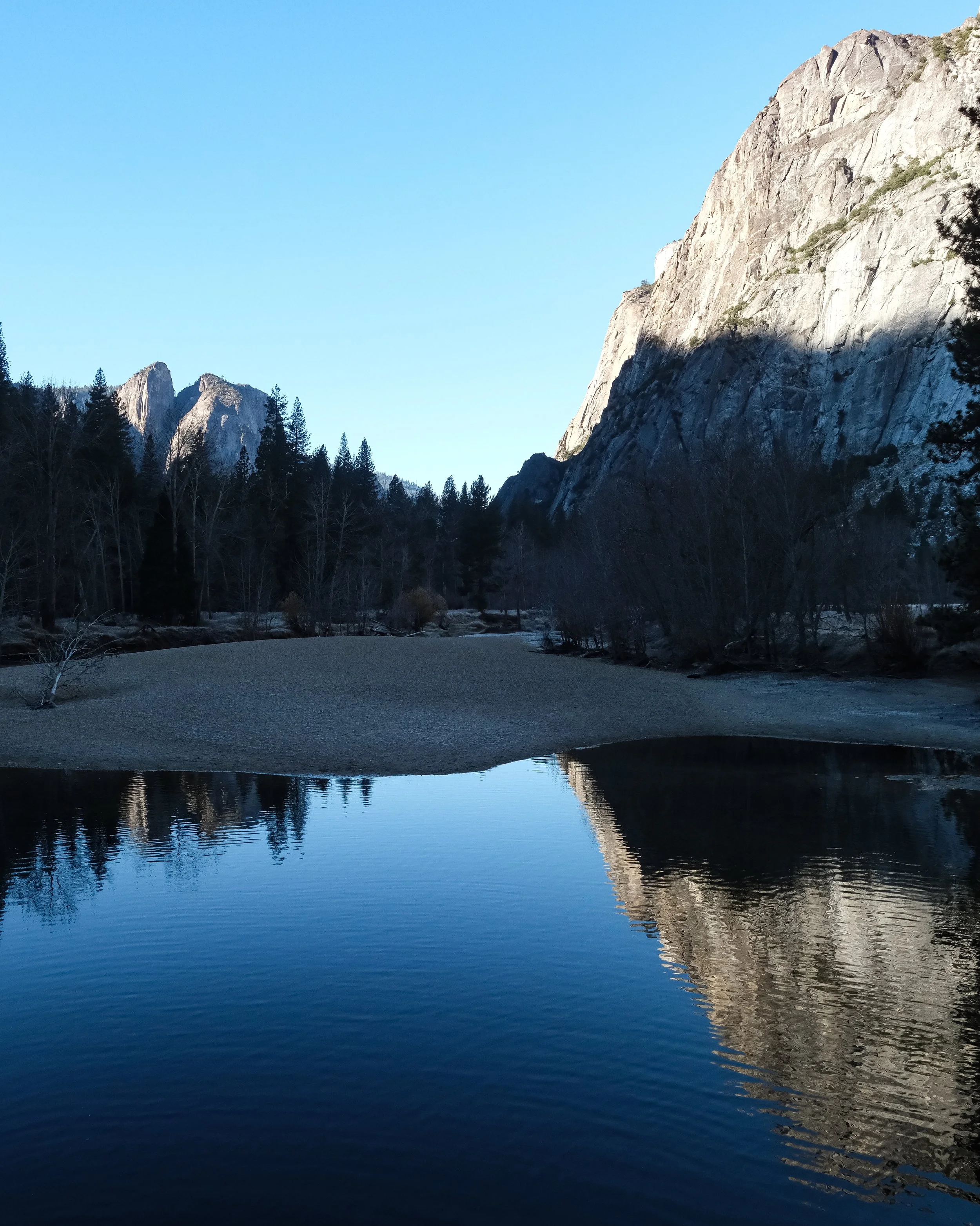 Snow-capped mountain surrounded by green forest and a river in the foreground.