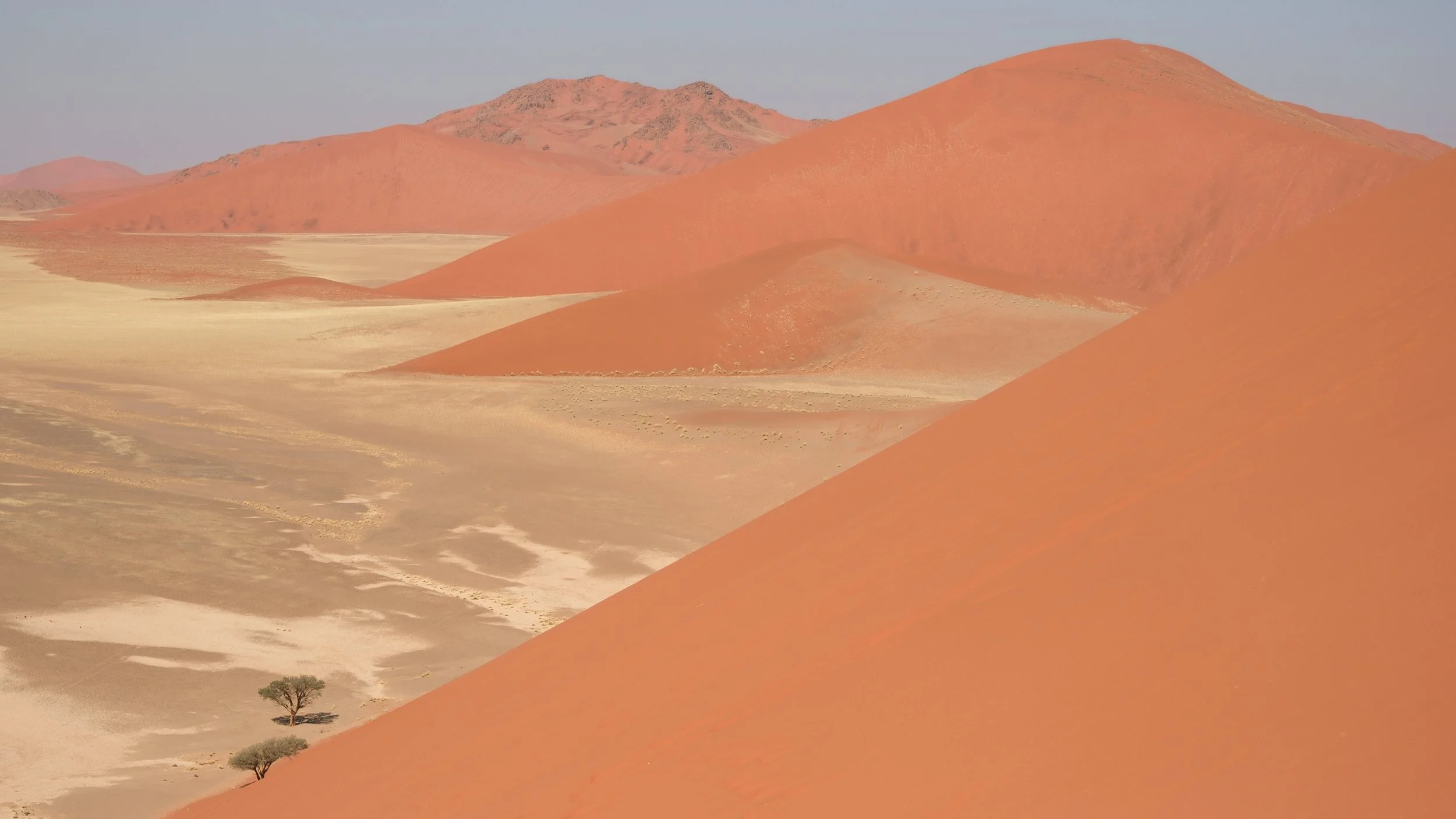 A lush green hillside covered with dense trees and vibrant orange-red flowers flowering across the landscape.