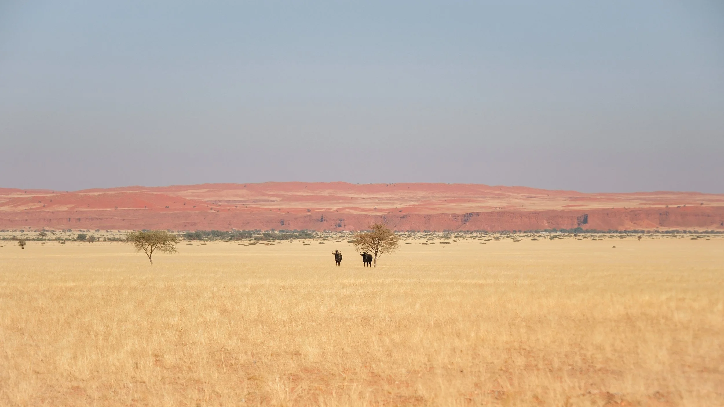 Large flat rock in a grassy, rocky desert landscape with shrubs and cliffs in the background.